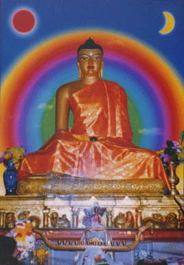 於法界中在五方佛之中央有 毗盧遮那佛 雙手結定印托缽,缽中灌滿香水,水中重疊二十五朵蓮花,其中第十三朵花之意剎是娑婆世界。而南瞻部洲的中央是聖地菩提迦耶